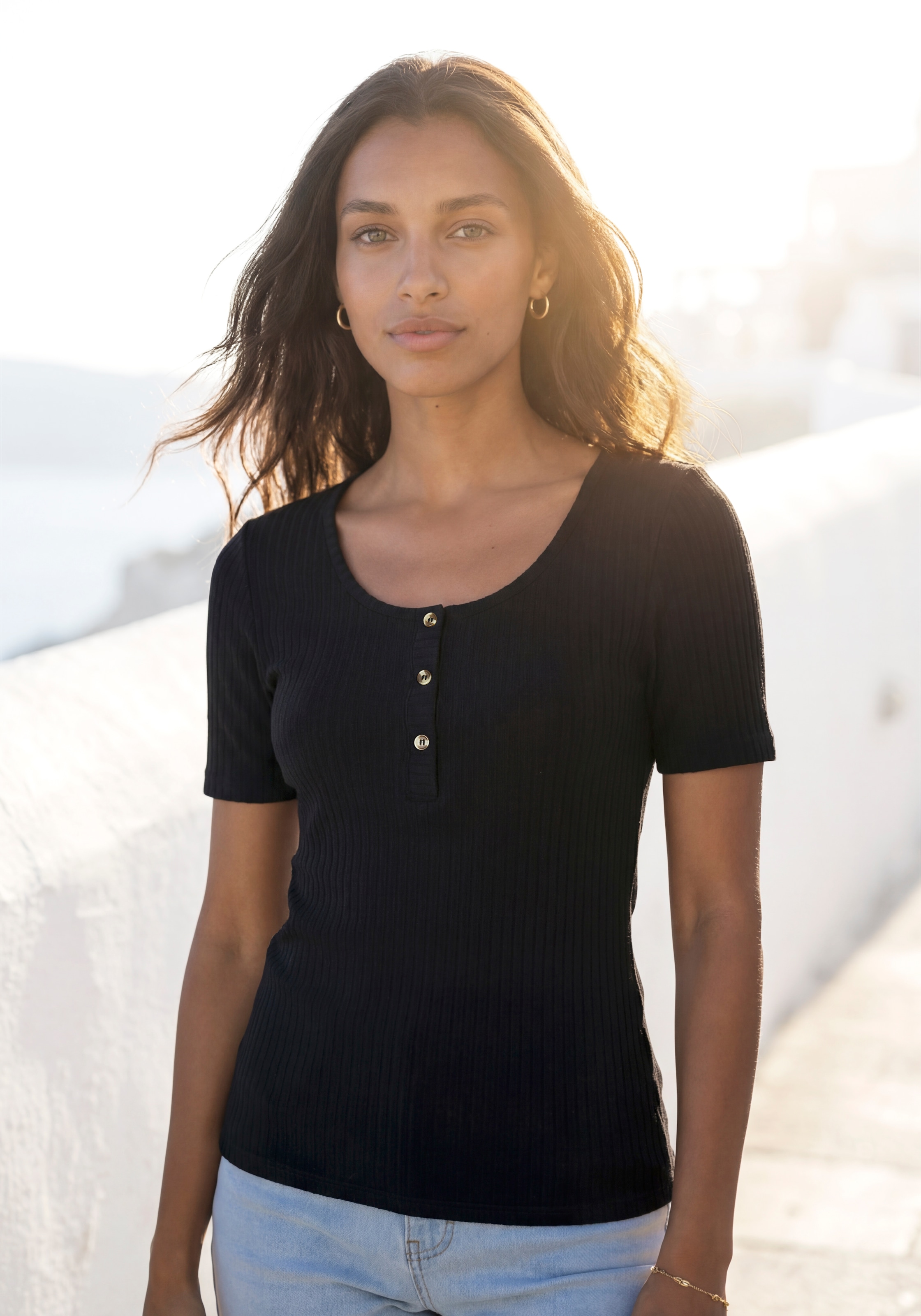 + Farben - T-Shirt »mit kurzer Knopfleiste« aus weicher Viskose-Ripp-QualitätLASCANAAktueller Preisab 29,99 €