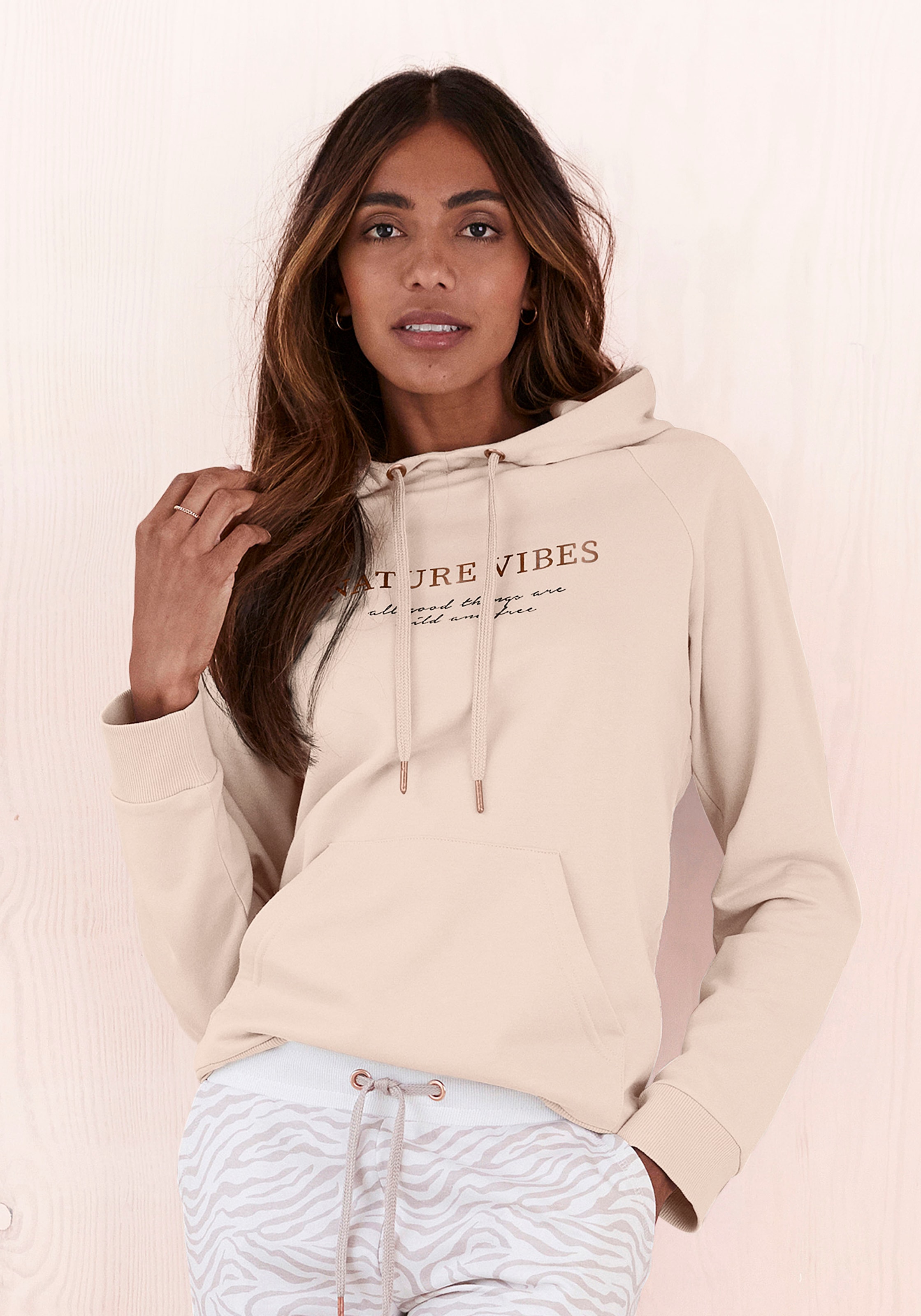 Kapuzenpullover von Lascana. Schöner Druck im Brustbereich und Kängurutasche. Raglanärmel mit Bündchen am Saum. Aus 50% Baumwolle (unterstützt Cotton made in Africa), 50% Polyester.