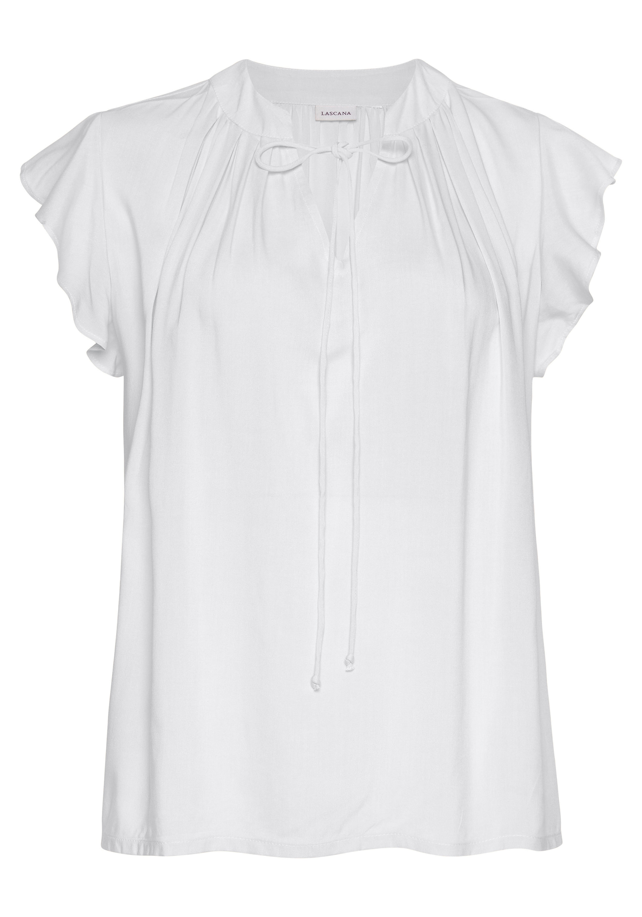 Kurzarmbluse von Lascana. Split-Neck mit kleinem Kragen und Bindebändern. Flügelärmel. Figurumspielend geschnitten. Trageangenehme Qualität.