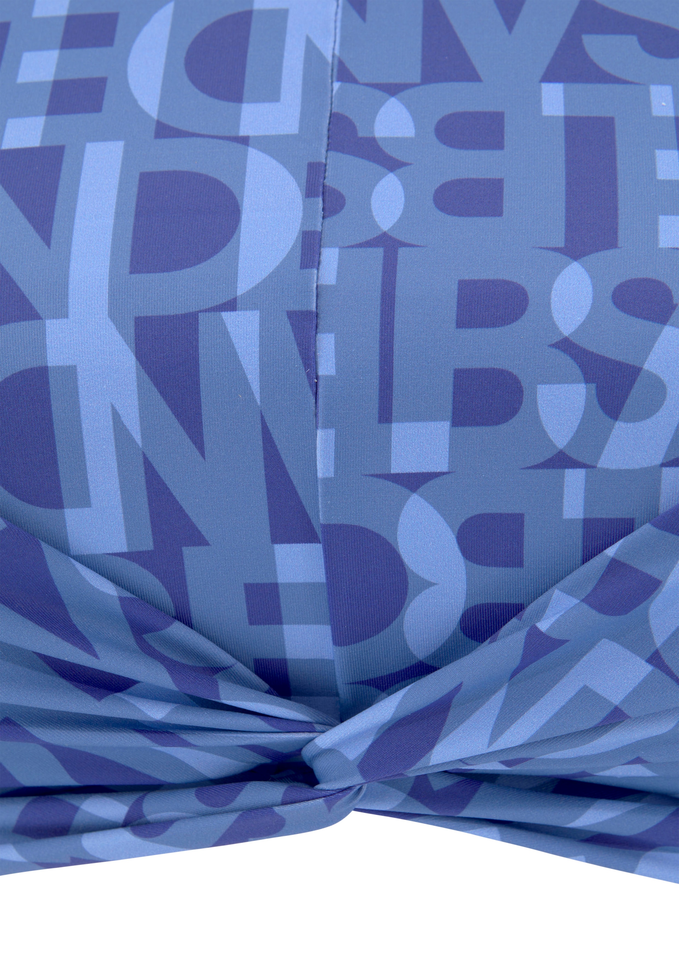 Stylisches Crop-Top von Elbsand mit modischem Marken-Alloverprint. Drapierung vorn, Cut-out hinten. Formgebende Stäbchen entlang der Seiten. Aus der Mix-Kini-Serie. Recyceltes Material.