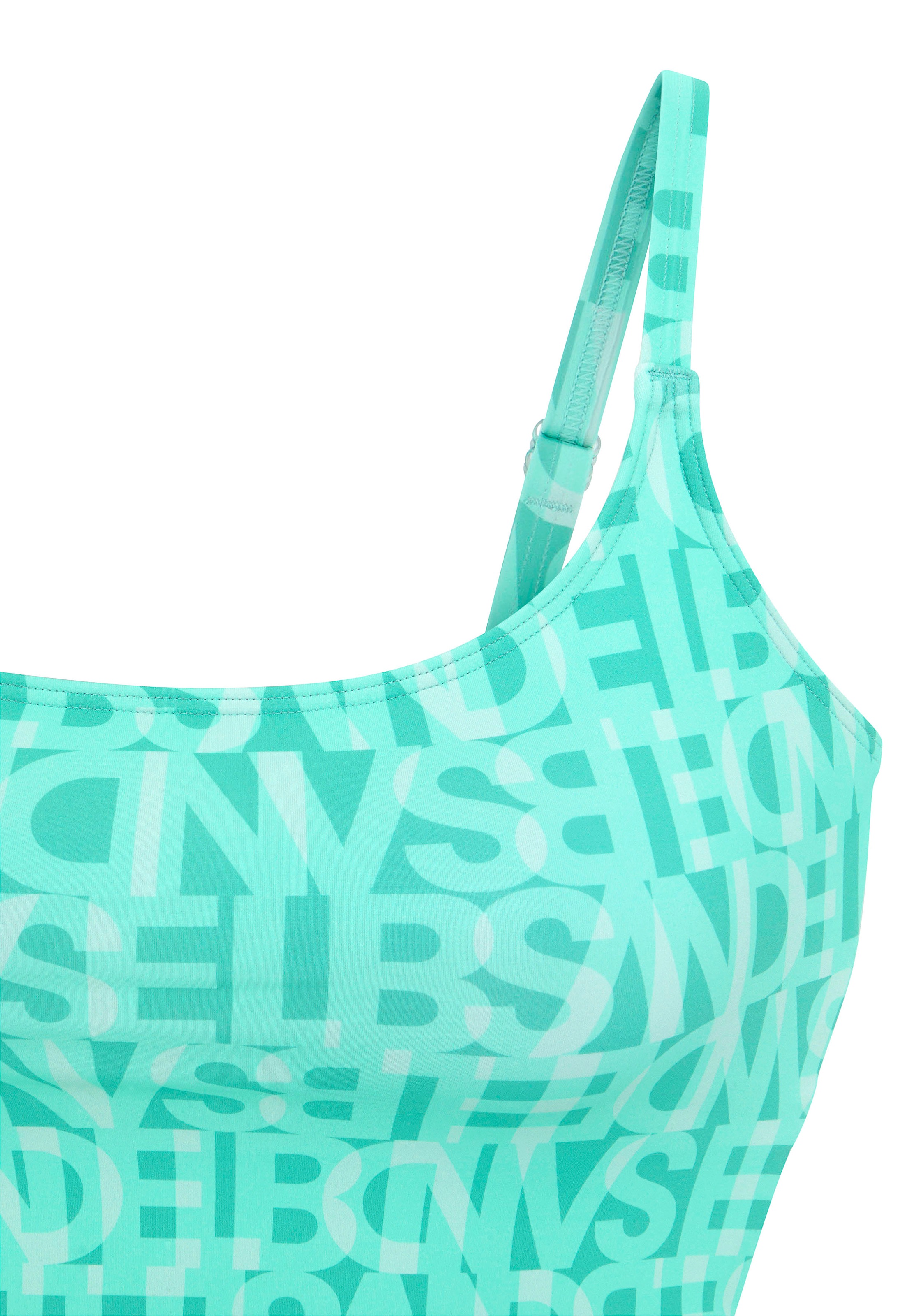 Tankini-Top von Elbsand mit Allover-Brandwording. Herausnehmbare Cups und verstellbare Träger. Körpernahe Passform. Aus recycelter Microfaser.