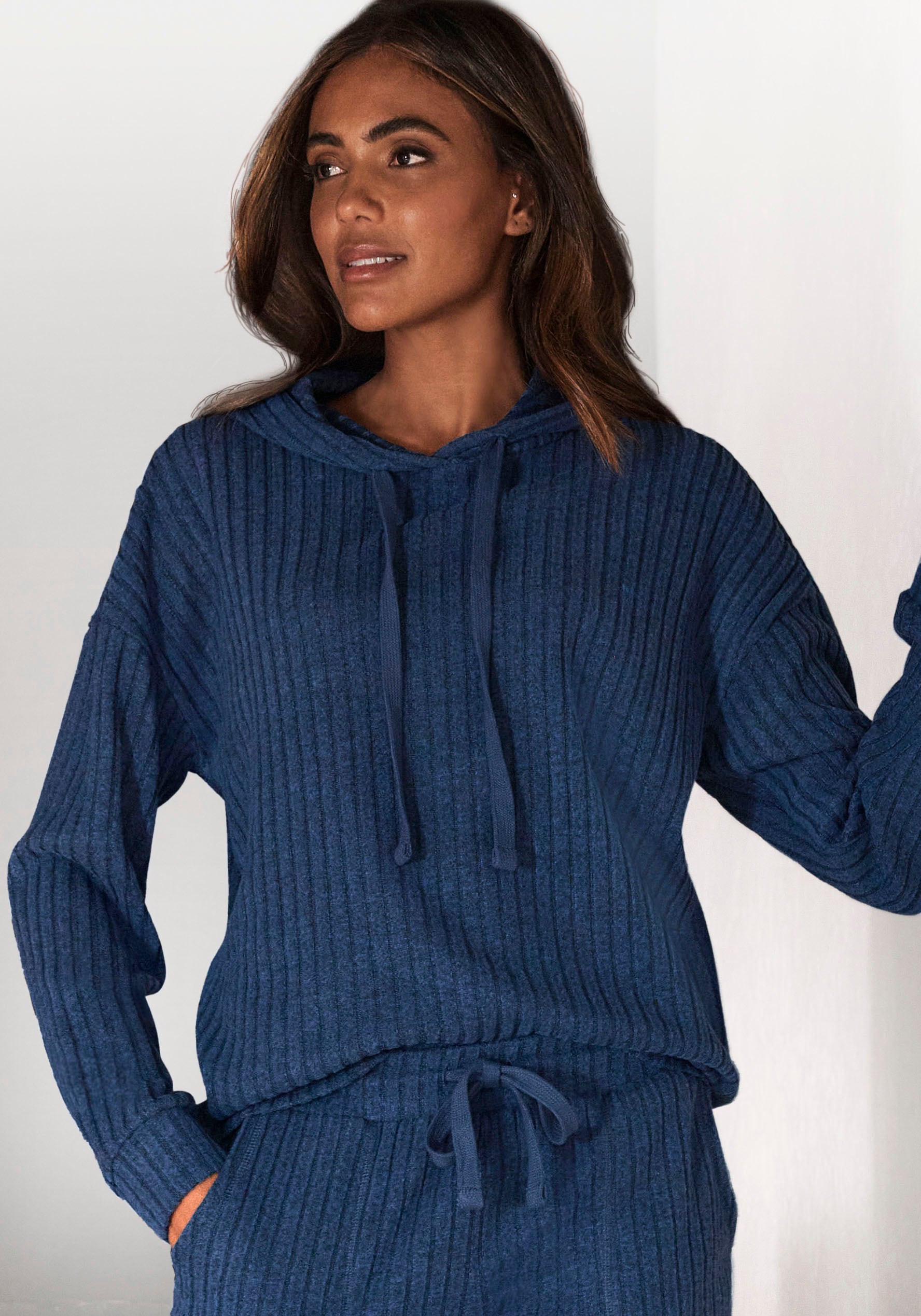 Hoodie von Lascana in breiter Rippenoptik. Tunnelzugkapuze. Lange Ärmel mit überschnittenen Schulternähten und angesetzten Bündchen. Figurumspielende Passform. Weiche Qualität.
