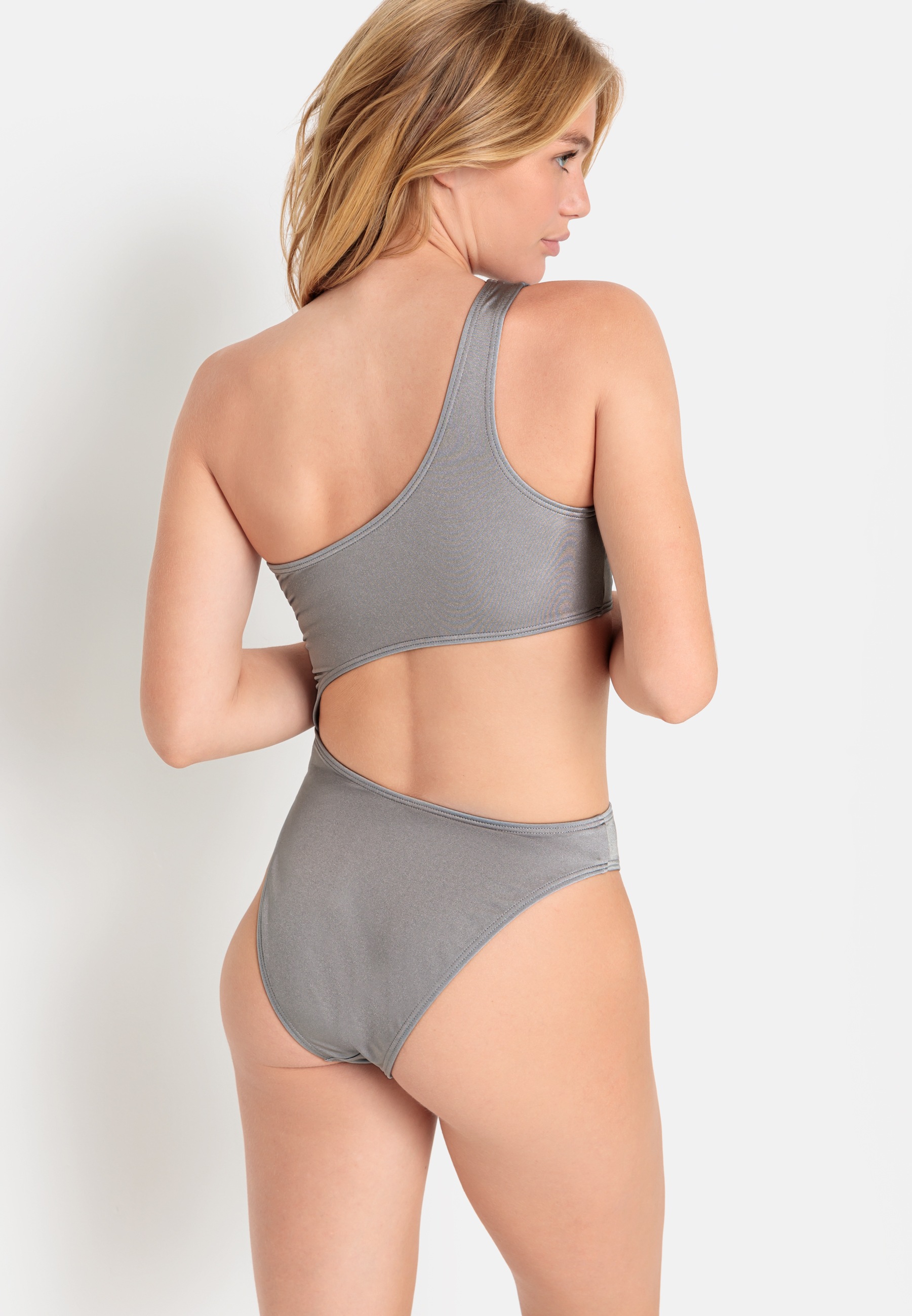 Monokini von LSCN by Lascana. Asymmetrisches Trägerdesign, Zweiteiler-Optik hinten. Sexy Cut-outs über Dekolleté und Bauch. Hoher Beinausschnitt. Glänzendes Polyamid mit trendigem Finish.