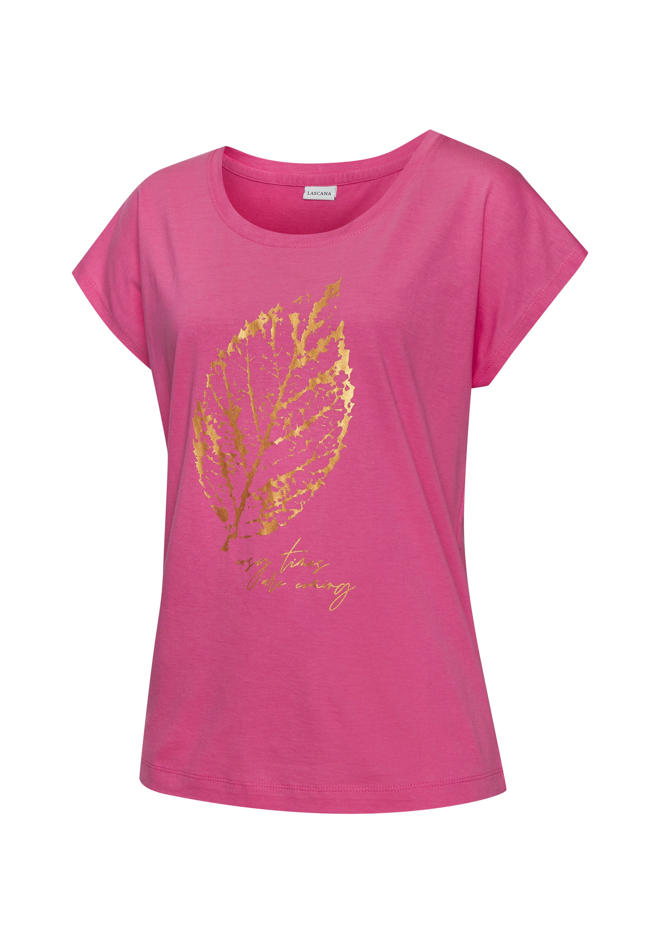 Schlafshirt von Lascana mit hübschem Folienprint vorn. Rundhalsausschnitt mit Abschluss. Kurze, nahtlos angesetzte Ärmel. Bequemer Schnitt. Weicher Baumwoll-Viskose-Jersey.