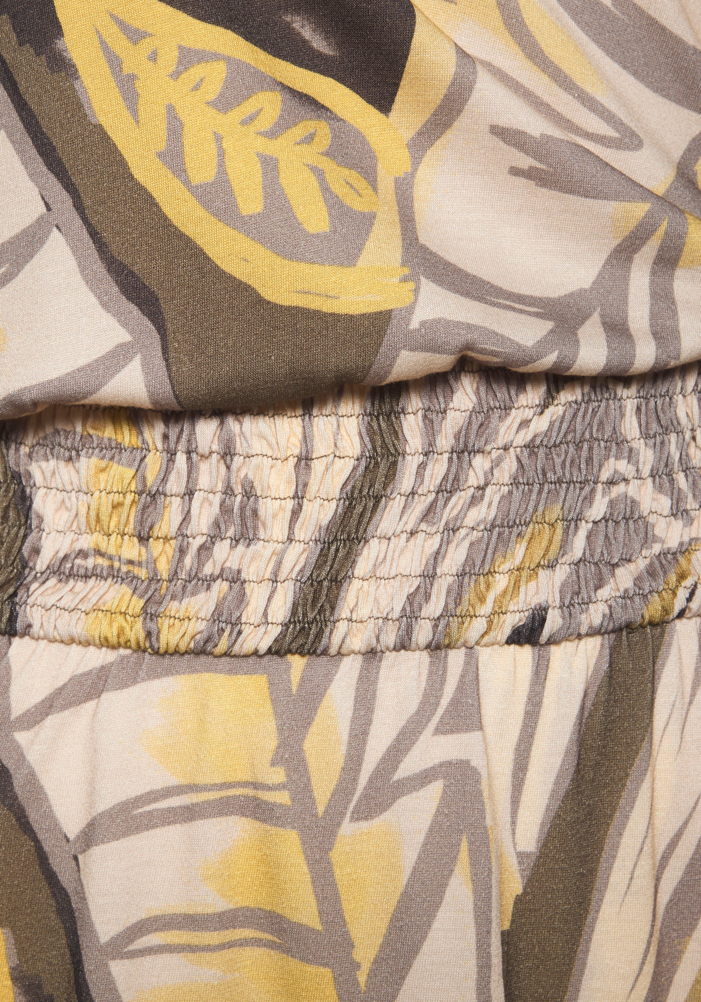 Sommerkleid von Lascana mit Allovermuster. Jedes Teil ein Unikat. Ärmelloses Design mit V-Ausschnitt und Smokeinsatz in der Taille. Figurnahe Passform mit ausgestelltem Rockteil. Weich fließender Viskosejersey.