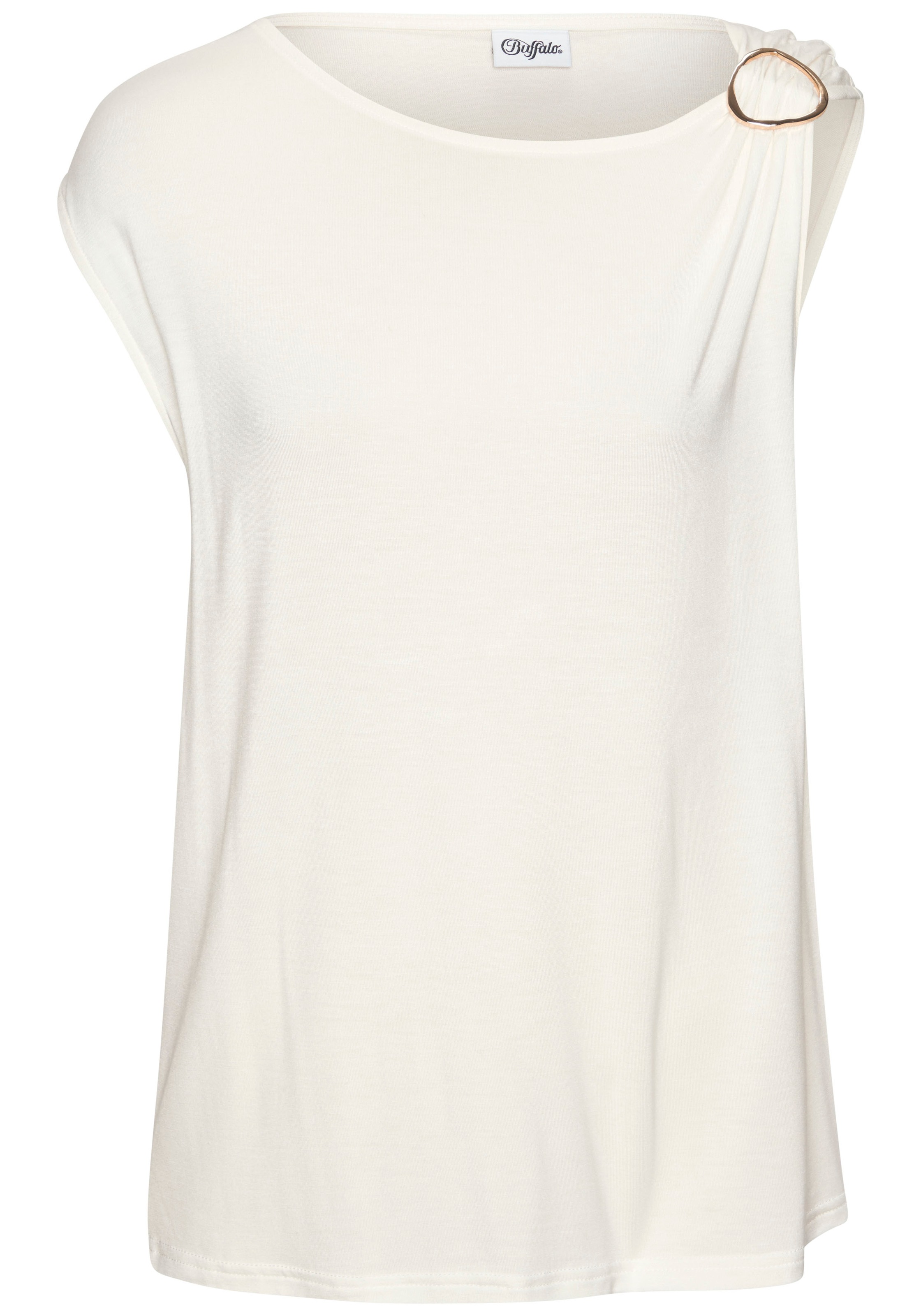 Hübsches Jerseyshirt von Vivance mit glänzender Zierschnalle an einer Schulter. Rundhalsausschnitt. Kurze, angeschnittene Ärmel. Figurumspielende Passform. Weiche, elastische Jerseyware.
