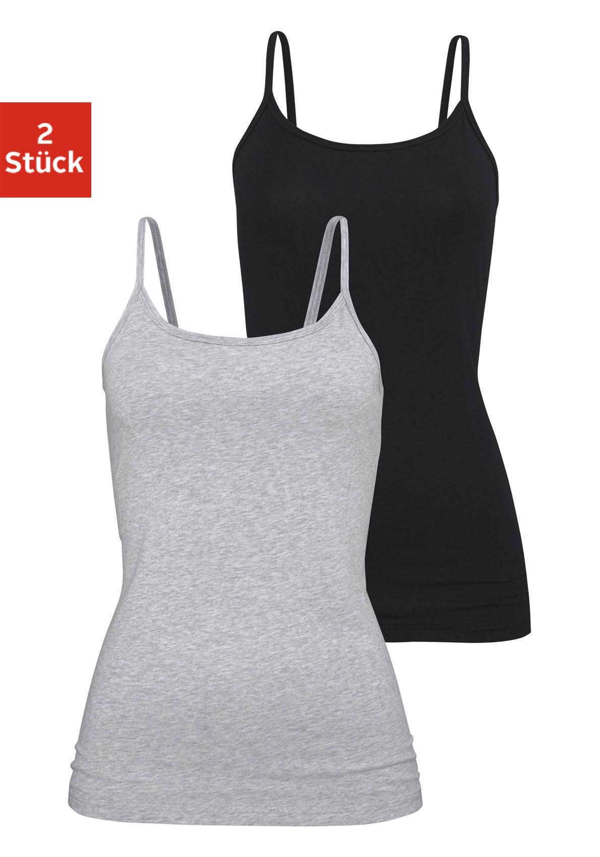 Tolles Spaghettitop von H.I.S im 2er-Pack. Flache Einfassungen am Rundhalsausschnitt. Aus angenehmer Baumwoll-Stretchqualität.