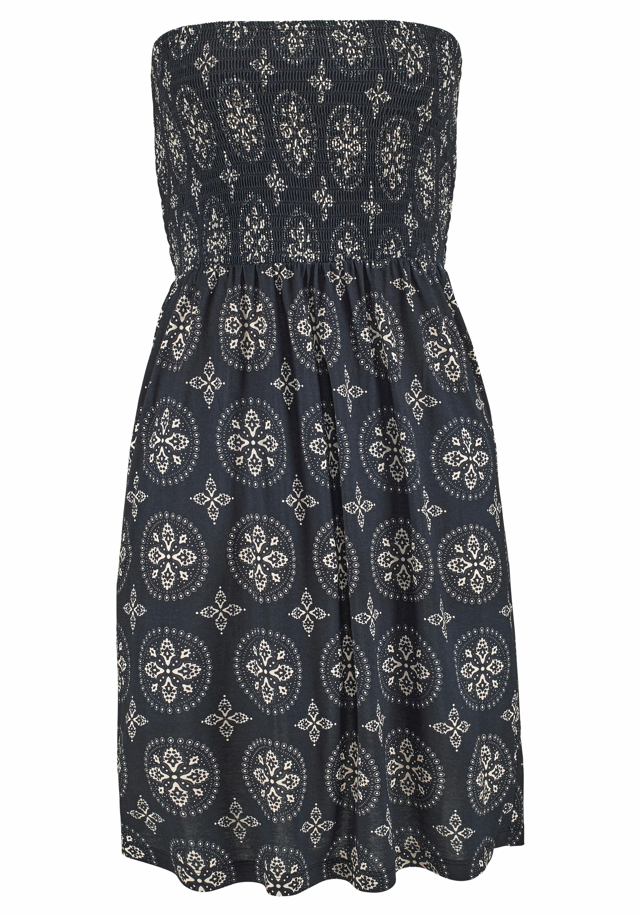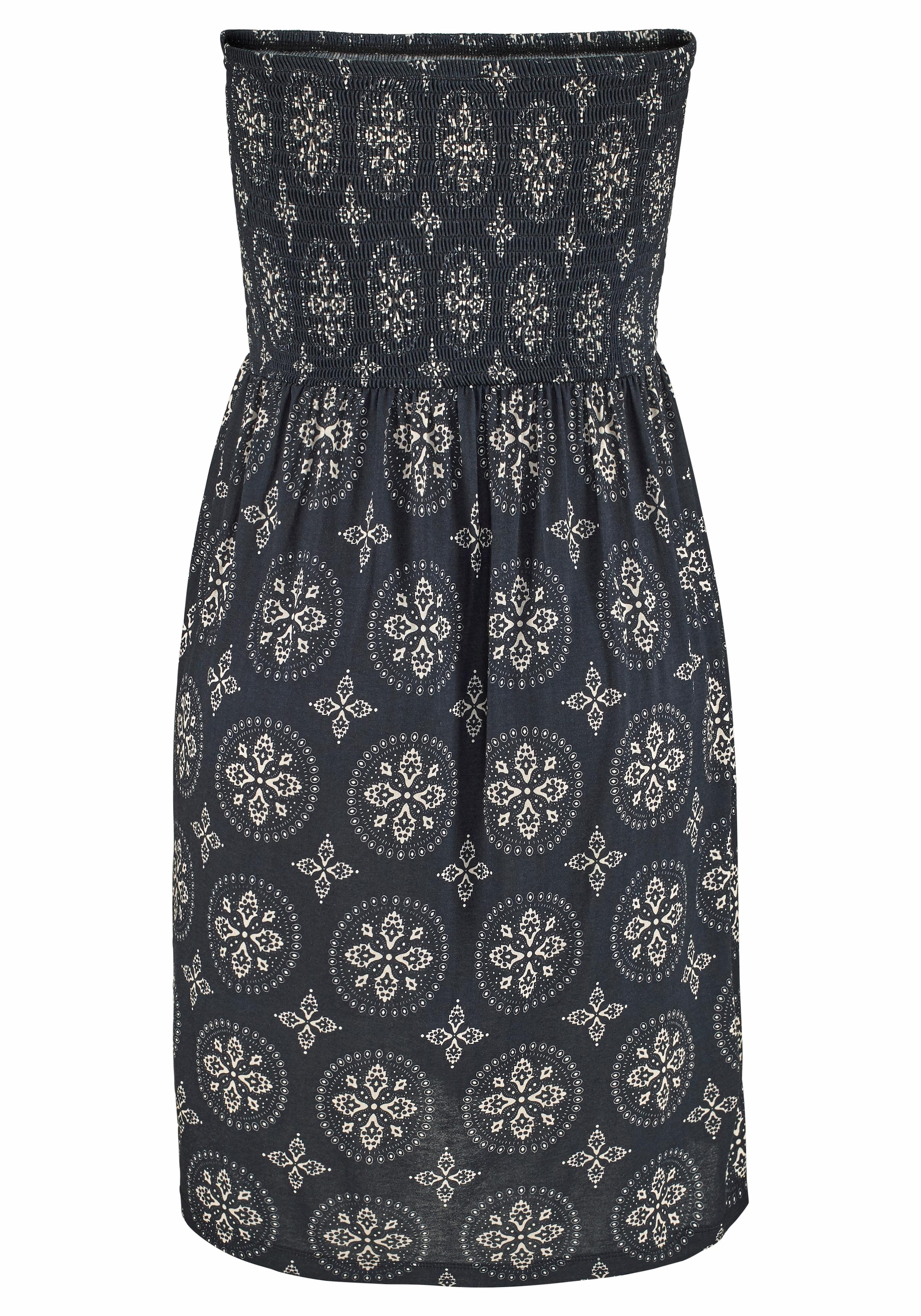 Besondere Merkmale | mit gesmoktem Oberteil im Alloverdruck, schulterfreies Sommerkleid |