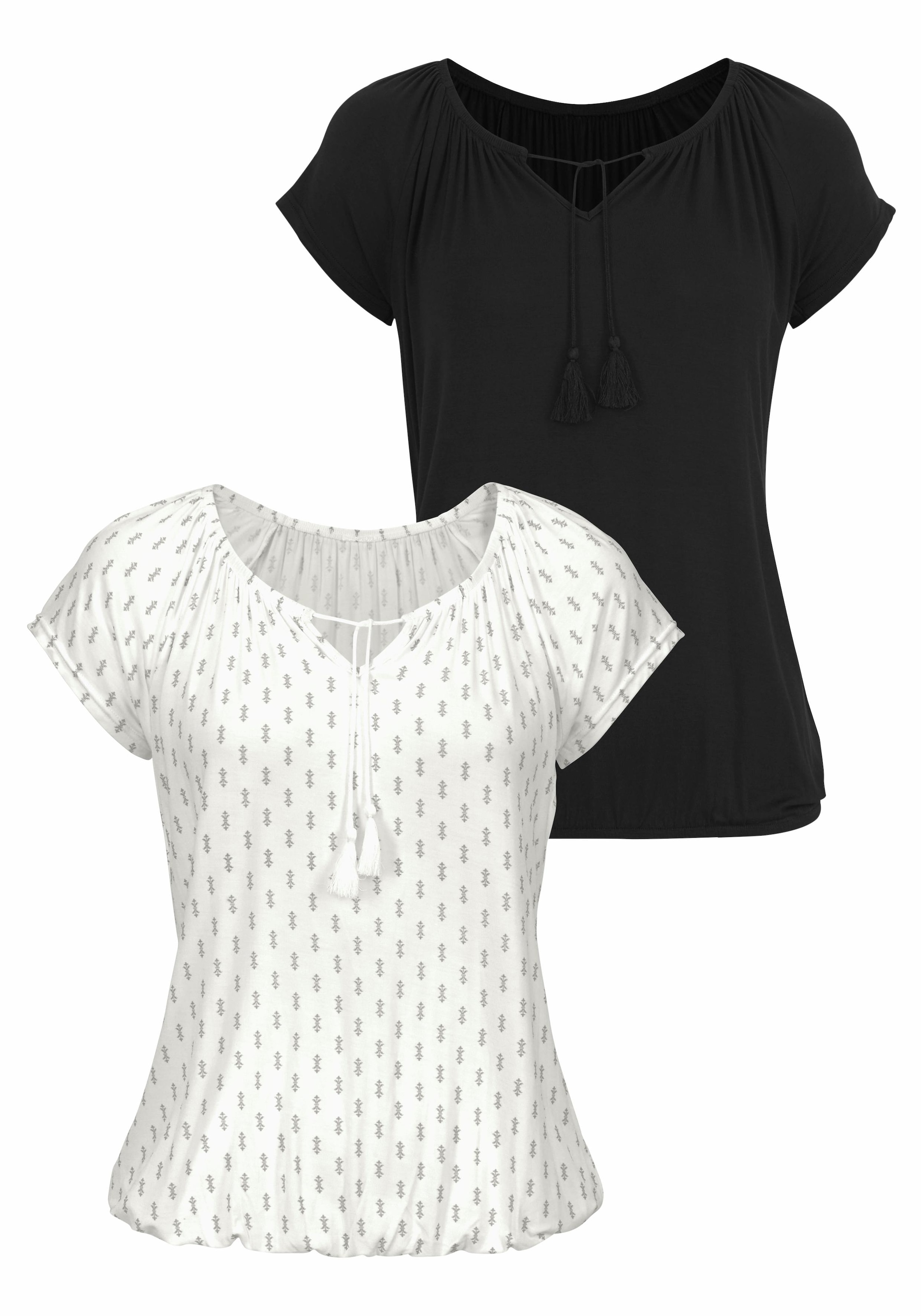 Vivance Shirts im 2er Pack. Rundhalsausschnitt mit Tasseln zum Binden und zarter Raffung. Gummizug am Bund für eine lässige Passform.