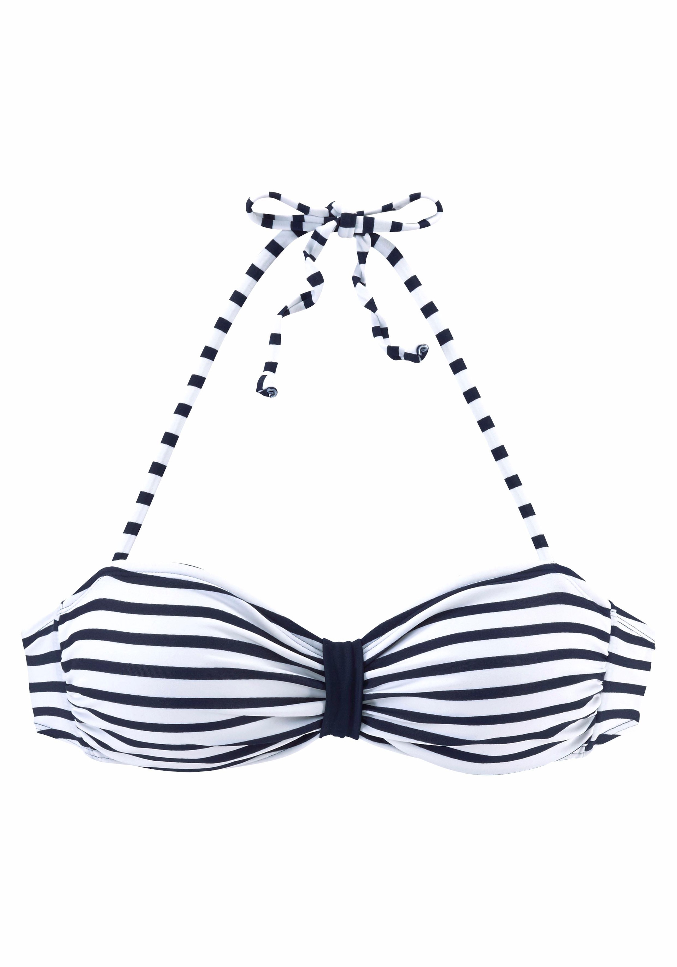 Mit herausnehmbaren Cups und seitlichen Stäbchen. Abnehmbare Träger, im Nacken zu binden. Top im Rücken zu schließen. In 2 Designs: mit Blumenprint oder komplett im Streifenlook.