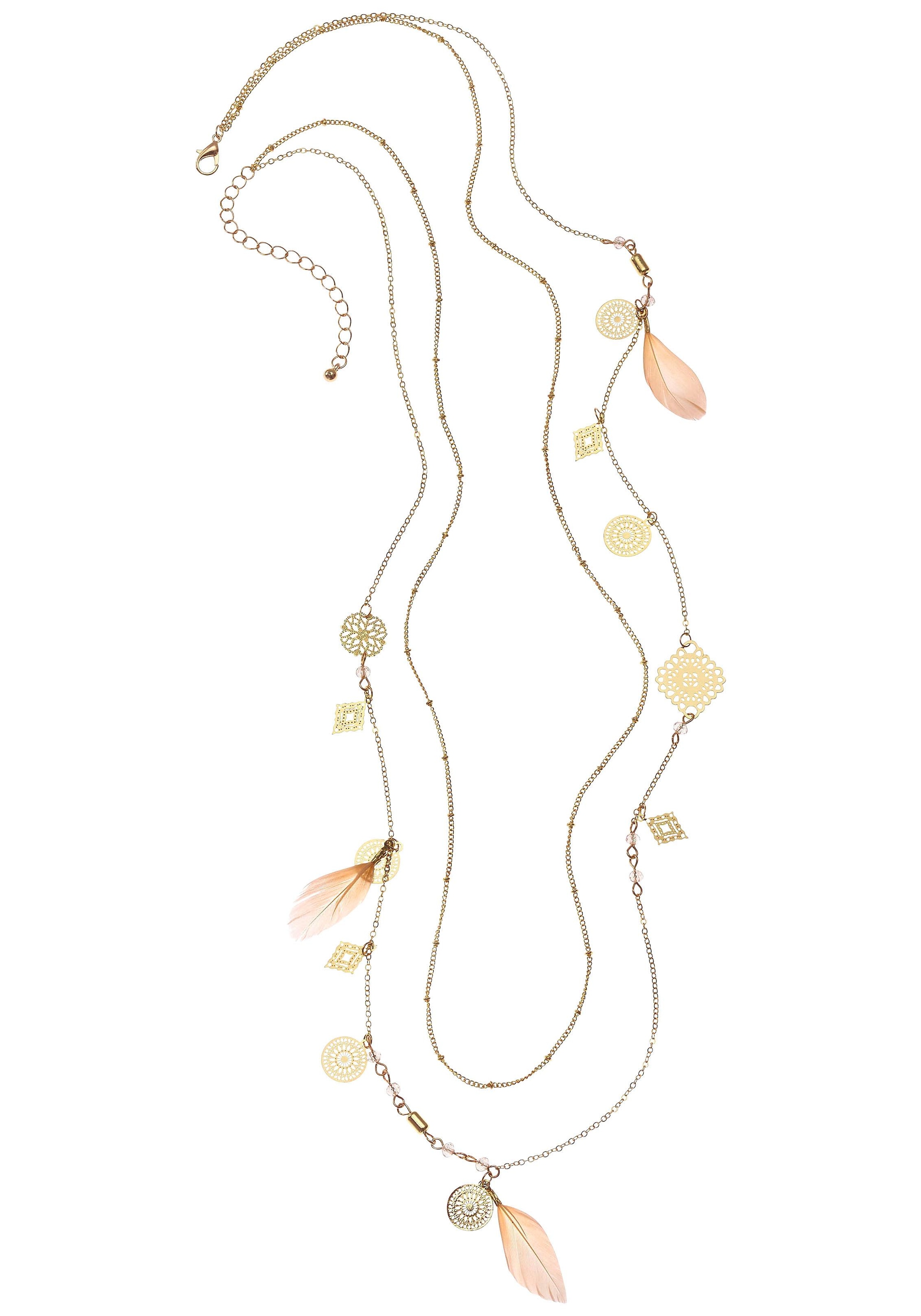 2-reihige Kette von LASCANA. Mit kleinen Ornament-Anhängern und Kunstfedern. Länge ca. 90 cm + 8 cm Verlängerung