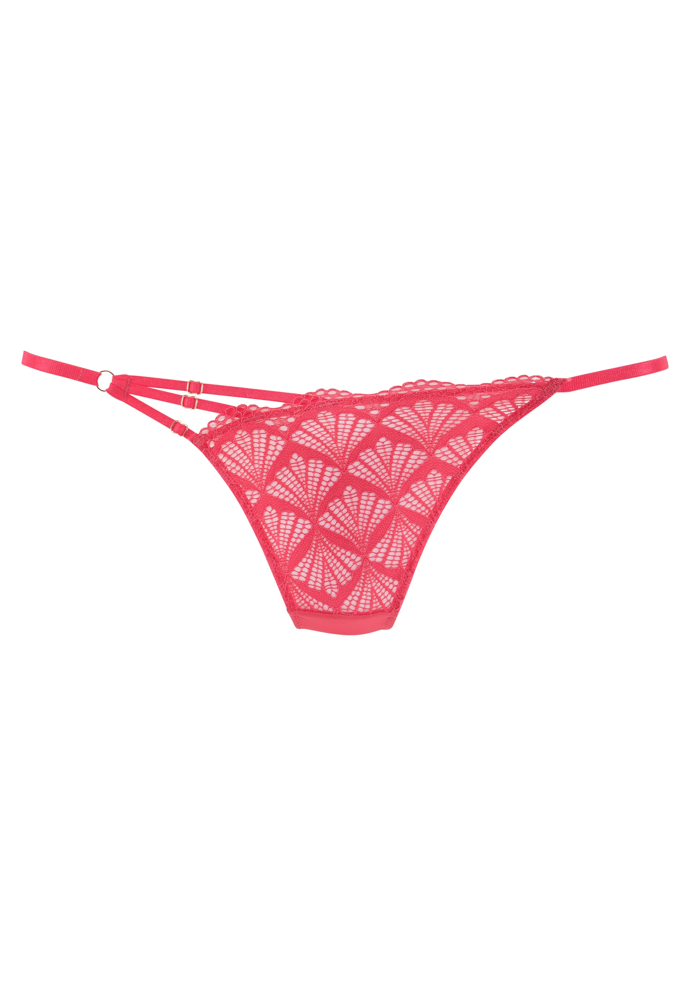 String, vorn aus edler, graphischer Spitze. Hinten aus leicht transparentem Mesh. Dekobänder vorn mit roségoldfarbene Schnallen. Mit Baumwollzwickel. Aus 90% Polyamid, 10% Elasthan.