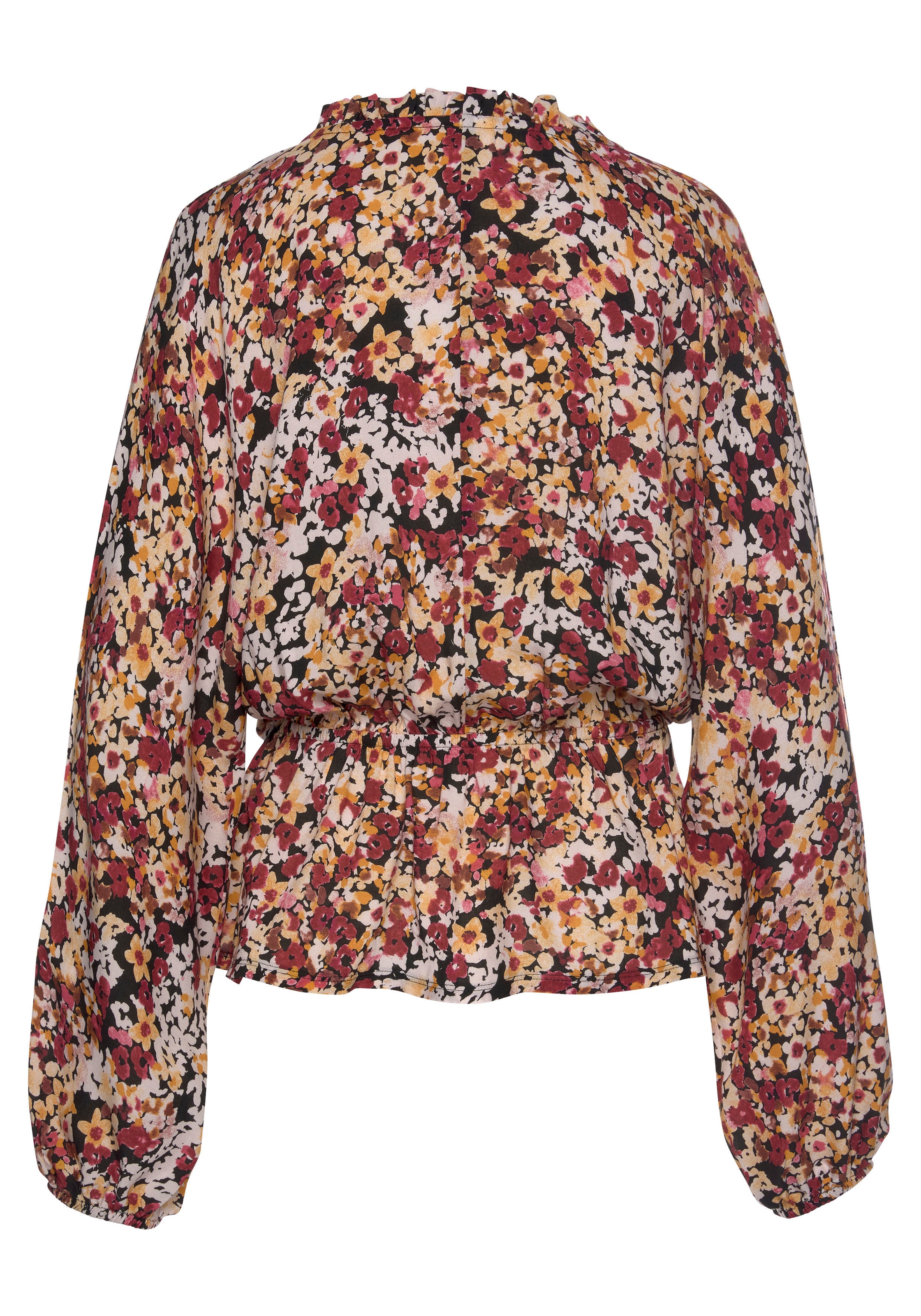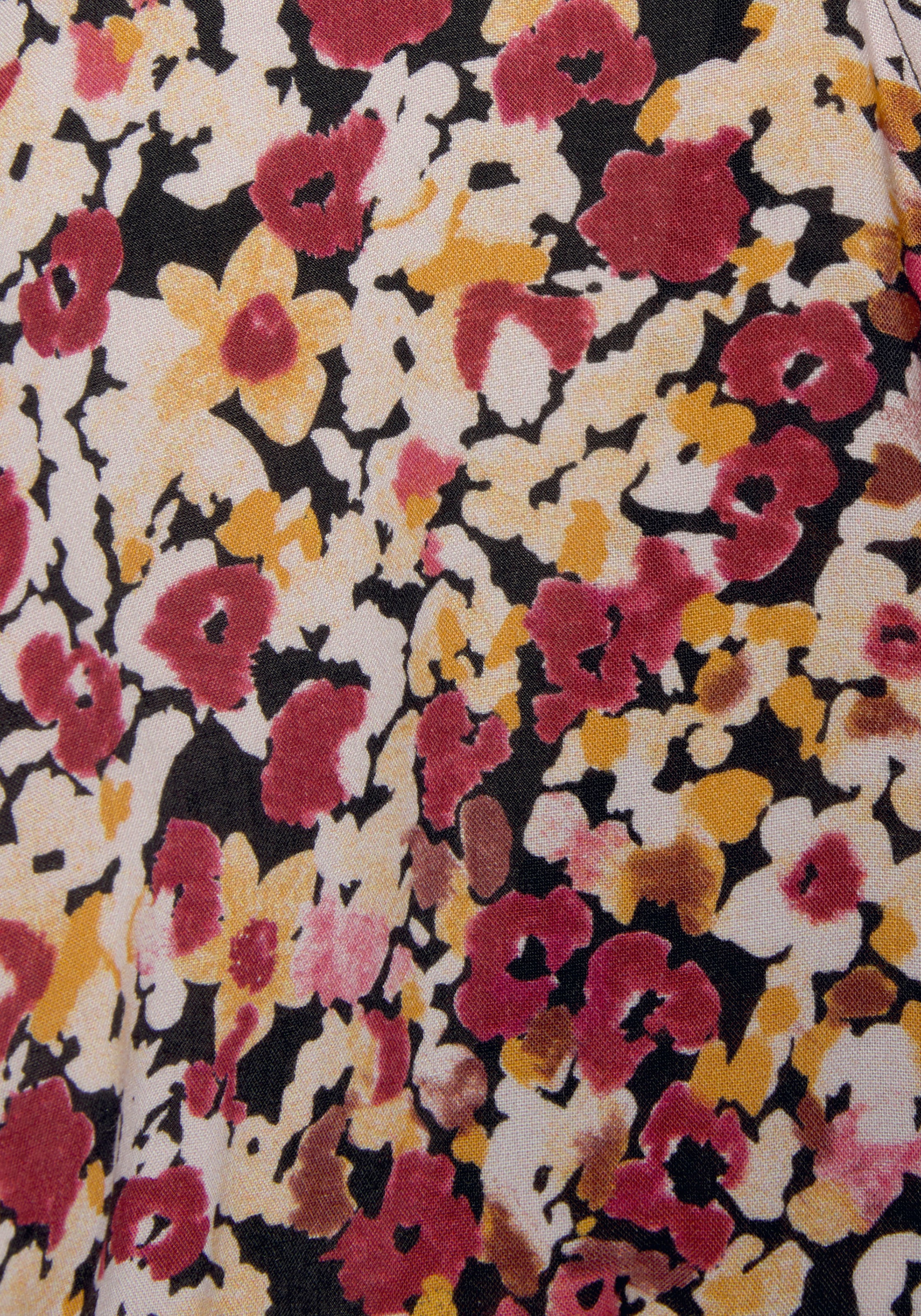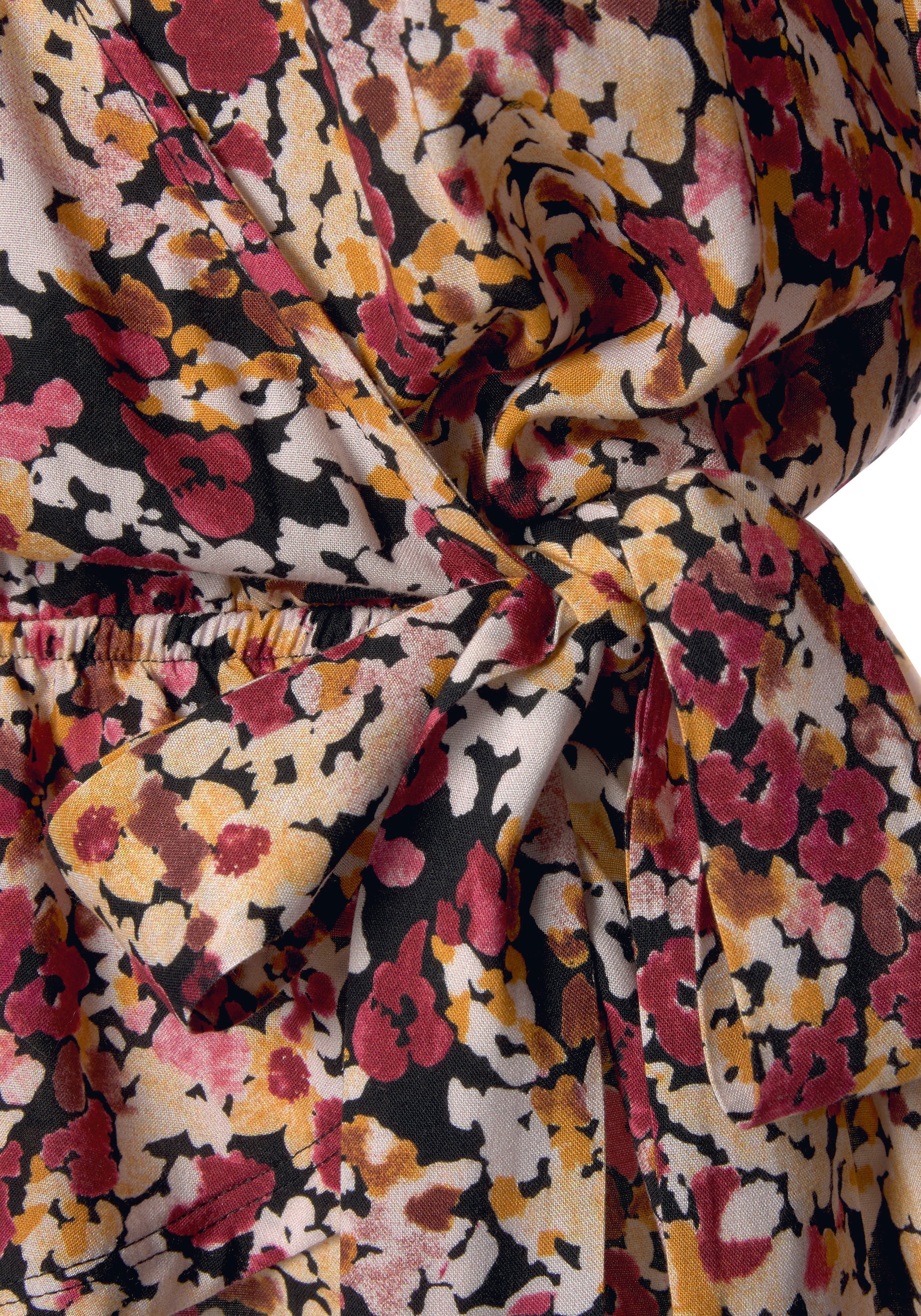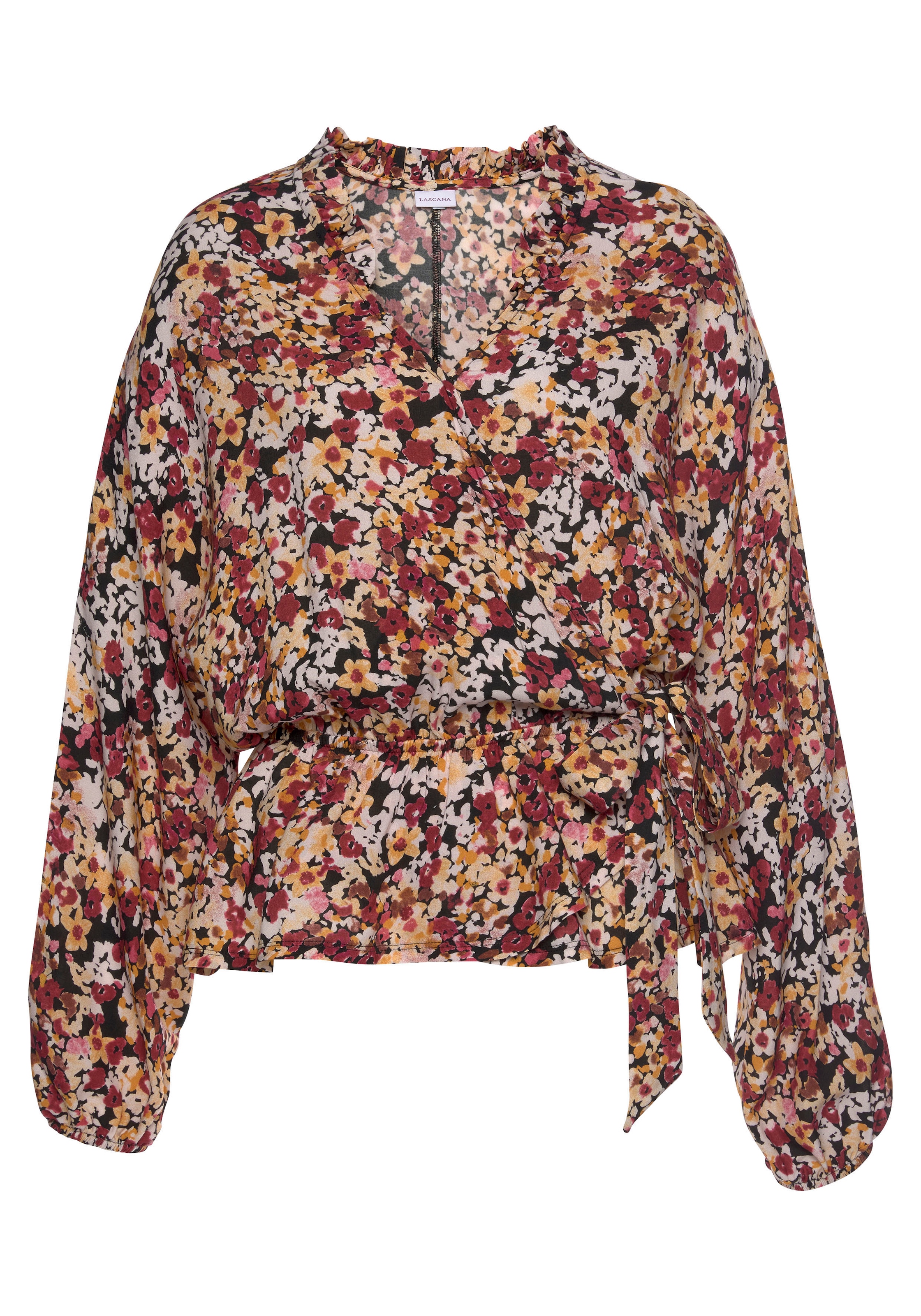 Bluse von Buffalo mit Blumendruck. Gekräuselter, überlappender V-Ausschnitt mit Druckknopf. Linke Seite mit fixierter Zierschleife. Lange Ärmel mit Gummizug am Abschluss. Bindeband in der Taille. Länge ca. 64 cm. Weiche, gewebte Qualität aus 100% Viskose
