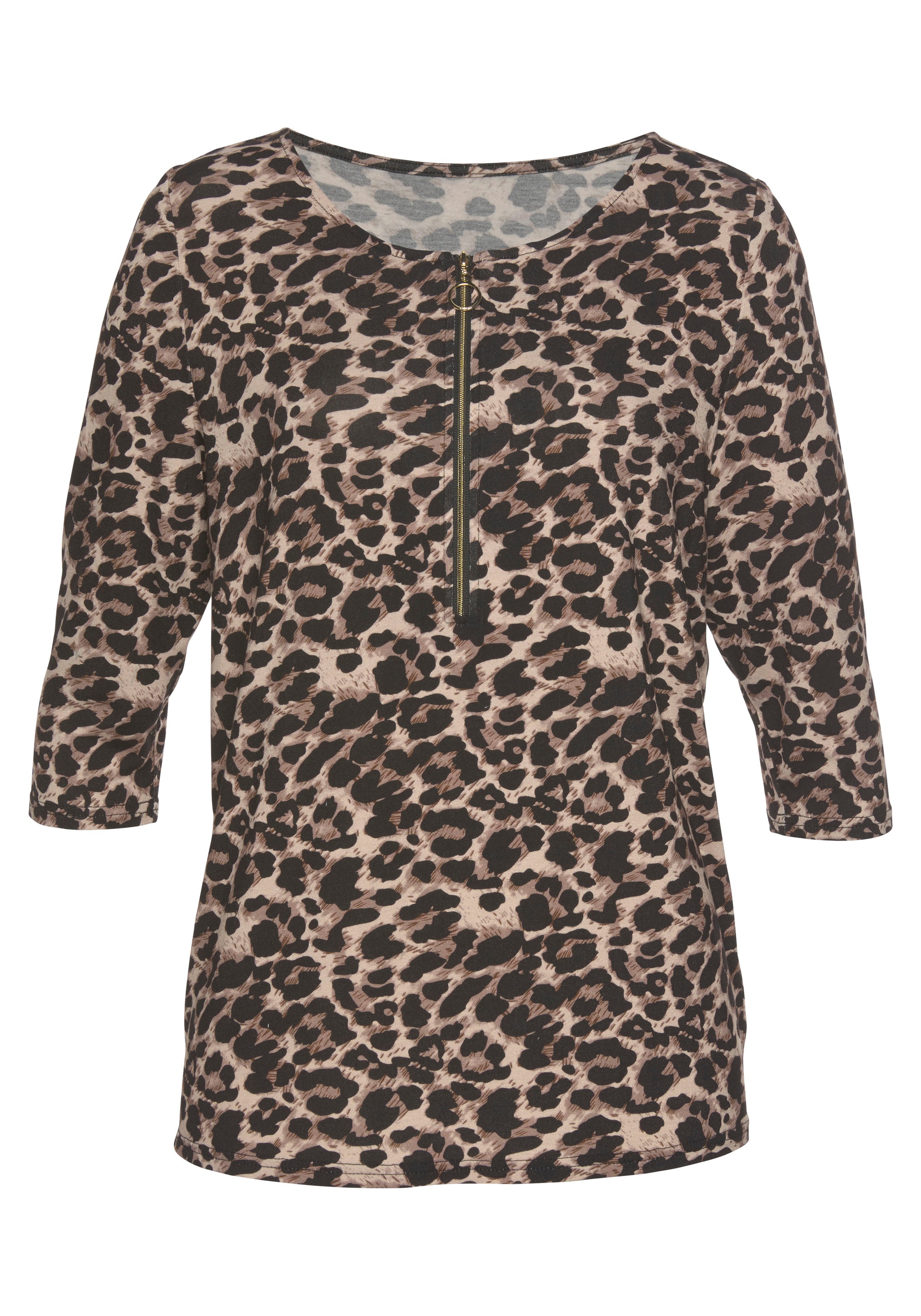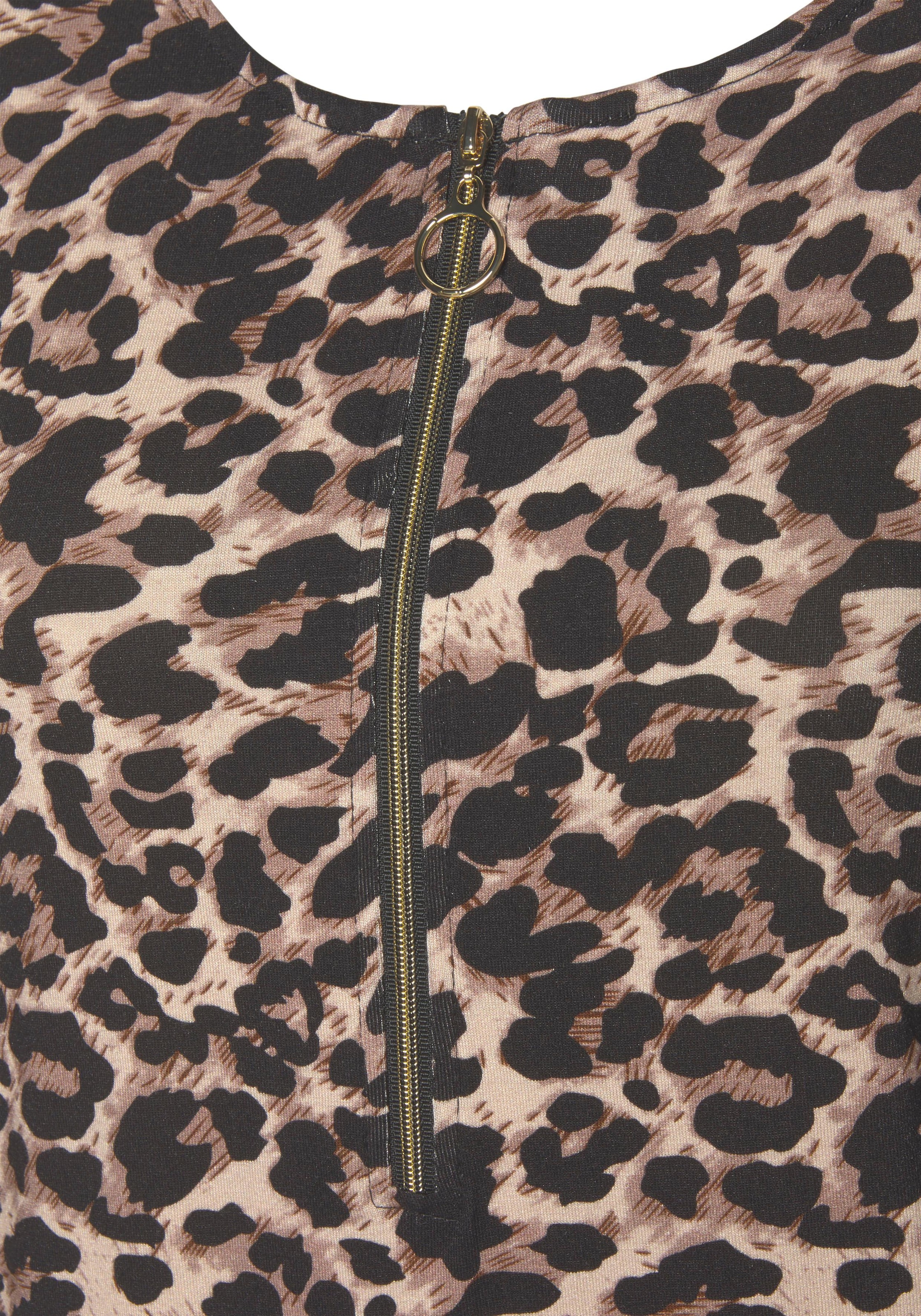 Mit Leodruck, jedes Teil ein Unikat. Goldfarbener Reißverschluss am runden Ausschnitt. Gerader Saumabschluss. Länge ca. 64 cm. Aus 95% Viskose, 5% Elasthan.